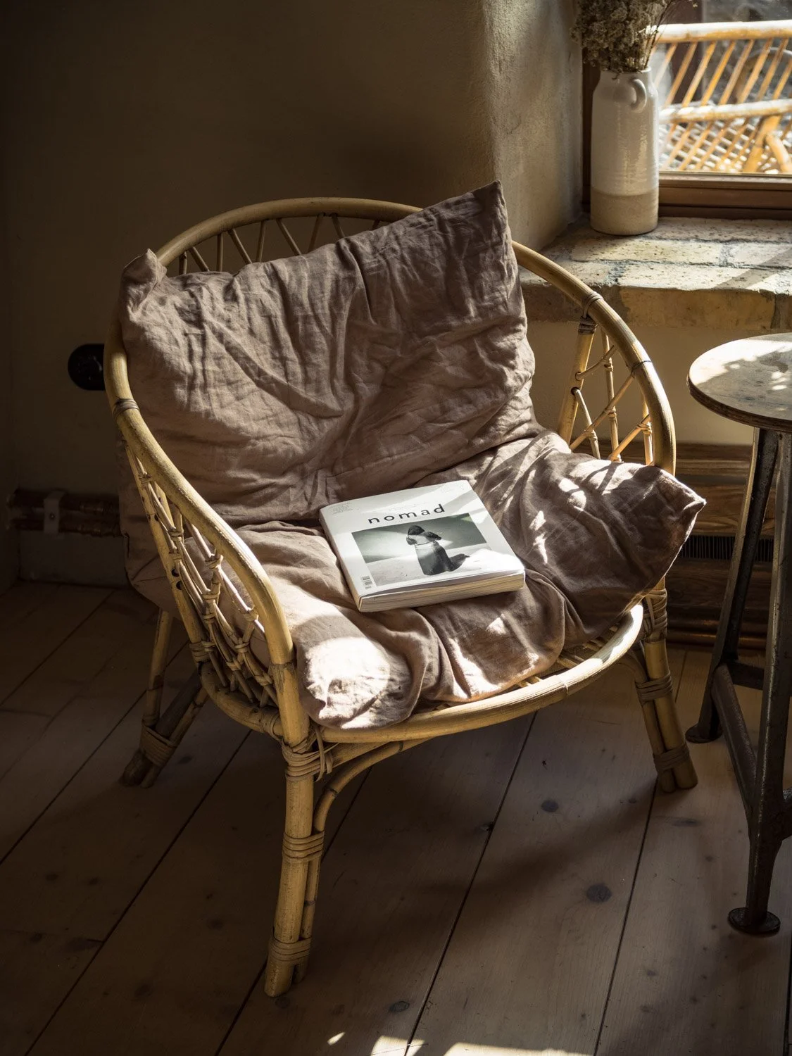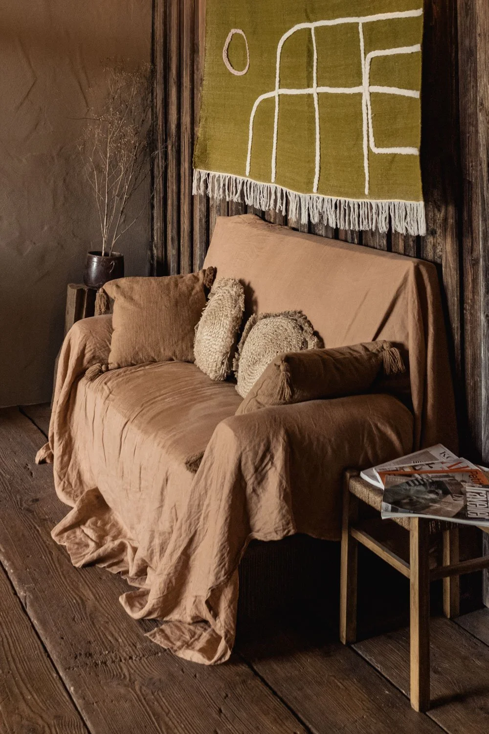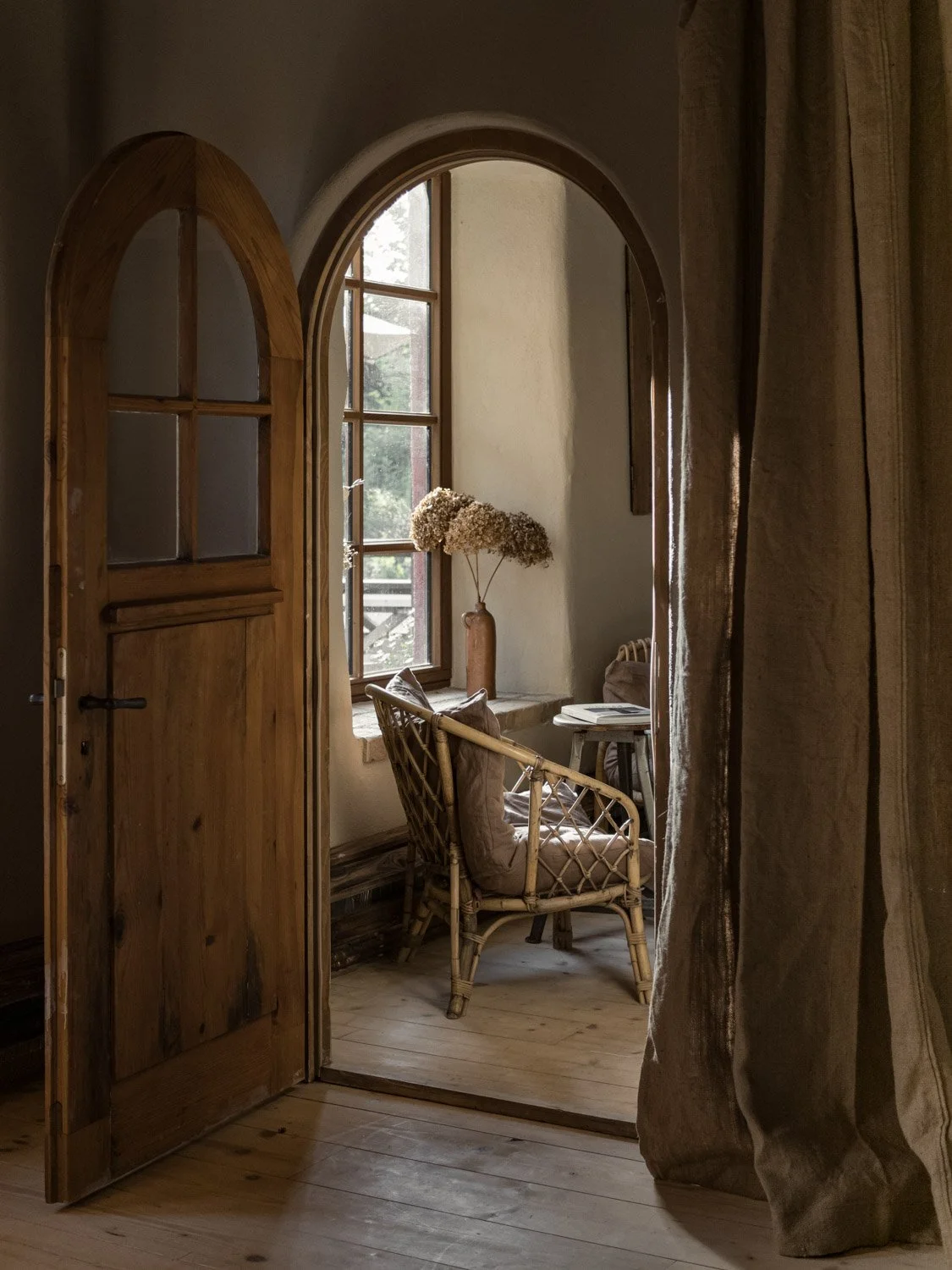 Contrasts are fundamental to Rosso's character—new elements coexist with older ones, and varied textures contribute to a harmonious overall feel. Handpicked vintage furniture from Tuscany and Bavaria, modern brass bathtubs, bamboo hanging chairs, linen textiles, and Moroccan-style rugs lend a unique identity to the interiors.